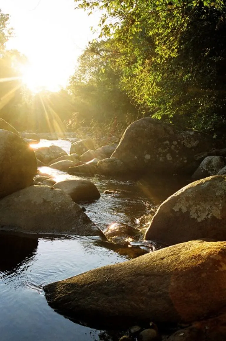 Passa dentro da Pousada Monte Crista, com água transparente.